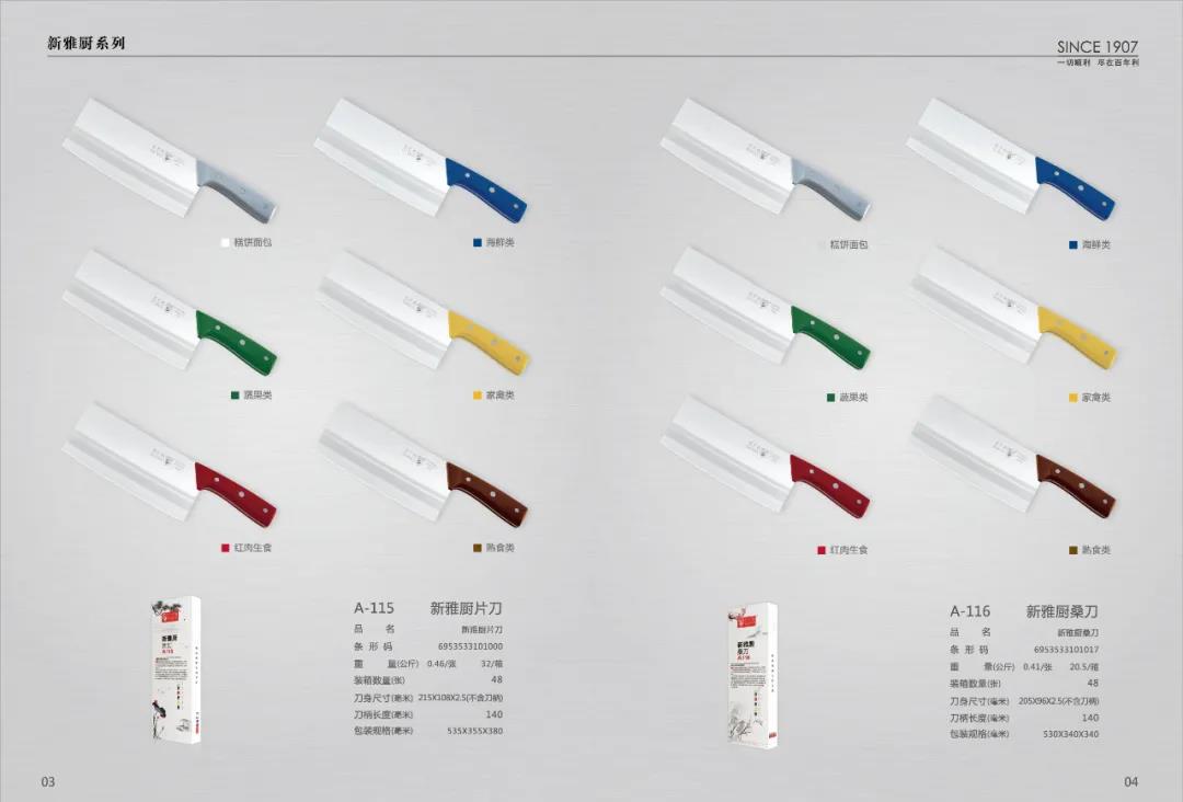 國(guó)宴系列、潮汕牛肉刀/名廚系列、大展宏圖系列、南方廚刀系列、九江彎刀系列、月山貞一郎系列、西式分刀系列,