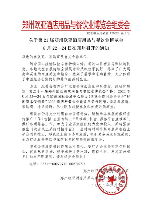 乘勢而為 重磅重啟 | 2022年歐亞酒店用品與餐飲業(yè)博覽會定于8月22日-24日在鄭州國際會展中心舉辦!